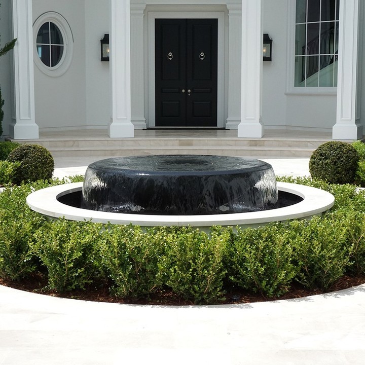 This circular, low-profile fountain feels incredibly refined. The dark stone contrasts beautifully with the greenery, creating a subtle but powerful focal point.