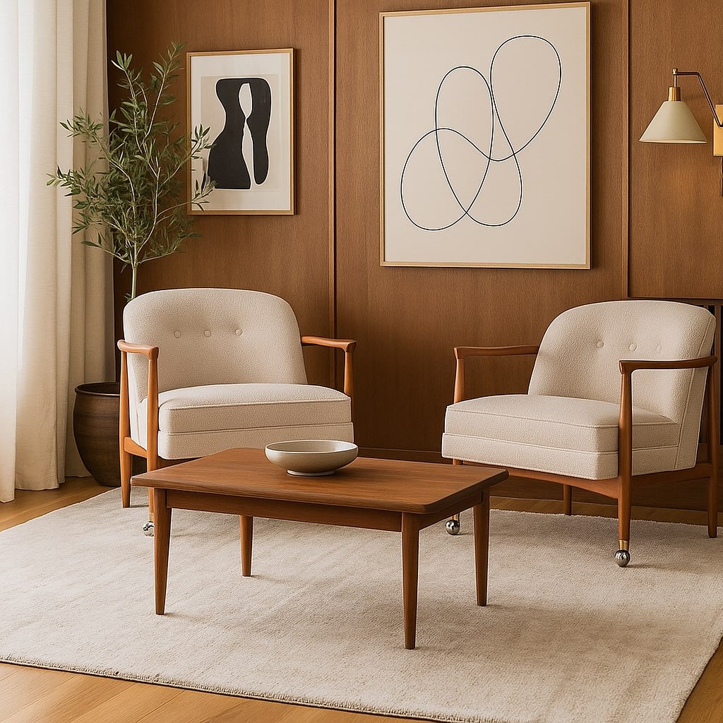 This setup feels calm in the most intentional way. Soft curves, warm wood, and a neutral palette that lets texture do the talking. The armchairs don’t overpower the room — they quietly anchor it.