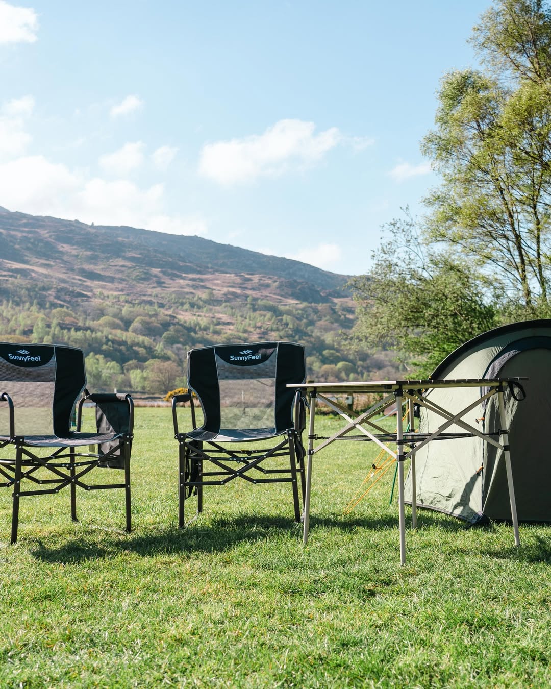 This is one of those setups that feels instantly familiar—in the best way. Two structured chairs, a slim folding table, and a tent pitched just close enough to feel cozy but not crowded. The silhouettes are practical, balanced, and built for real-deal camping days.