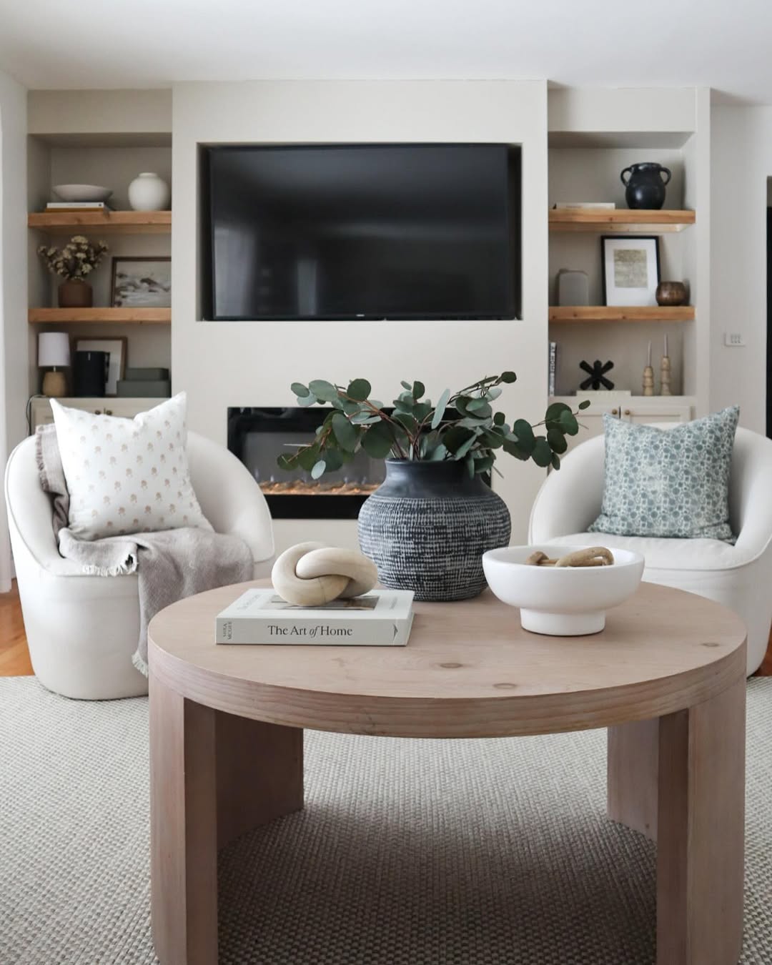 There’s a calm clarity to this space—light wood, rounded forms, and pale neutrals come together in a refreshingly modern way. A circular coffee table holds a sculptural knot, leafy greens in a charcoal vase, and a bowl of stones, proving that minimal doesn’t mean empty.
