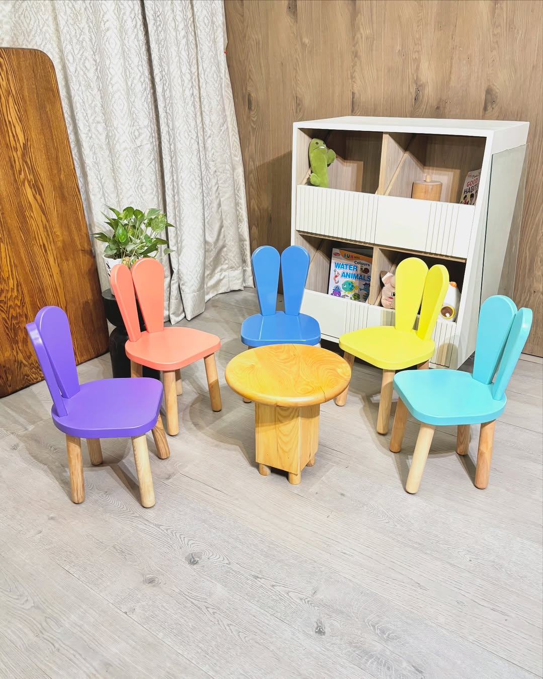 This setup feels like childhood distilled into furniture. The bunny-ear chairs in cheerful colors instantly create a “circle time” vibe—inviting, social, and just structured enough to keep things calm. The natural wood table in the center grounds all that color so it doesn’t tip into chaos.