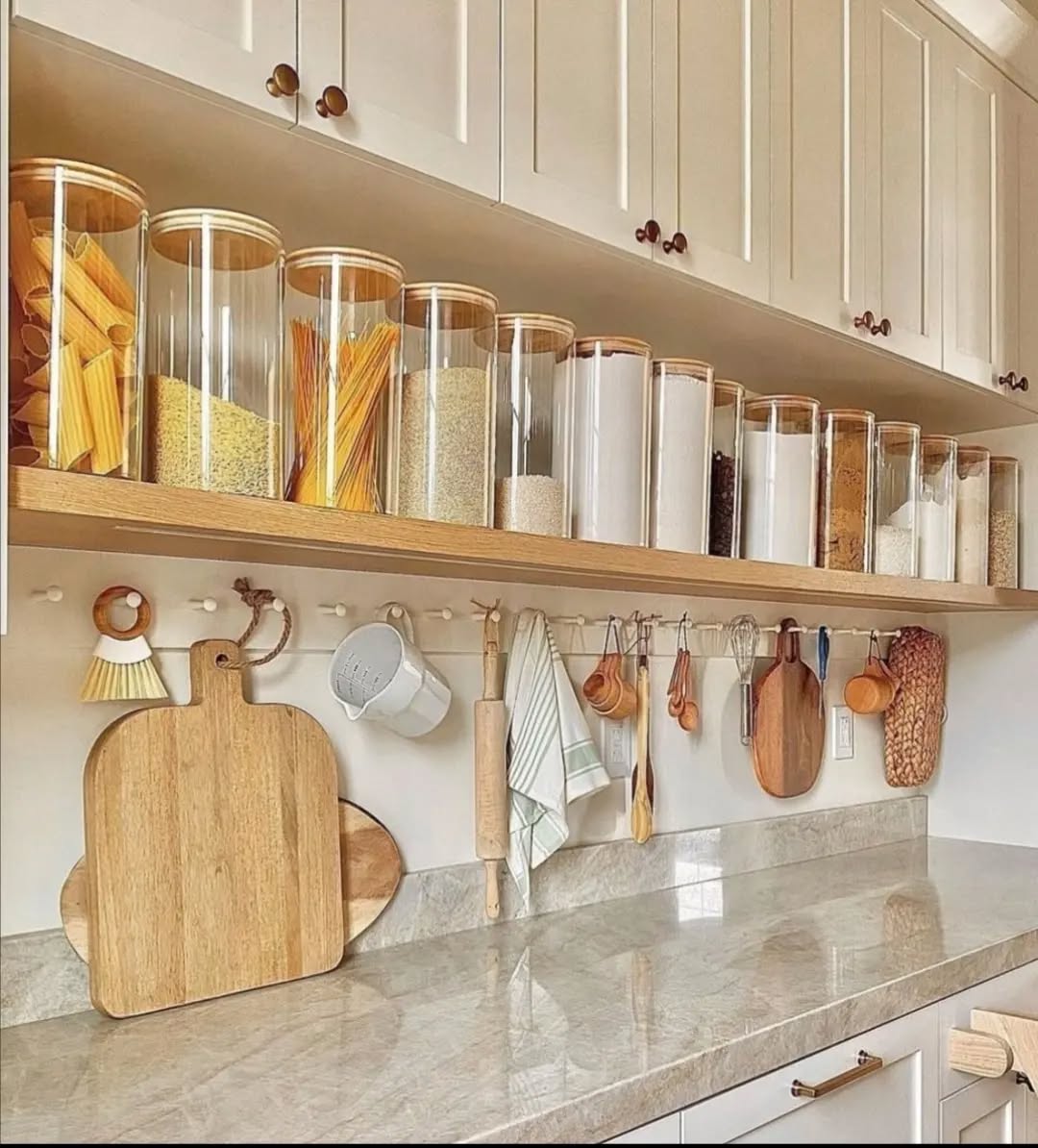 This countertop is so soothing — long rows of matching jars, wood accents, soft neutrals, and a tidy hanging rail. It’s giving “chef-approved meets Scandinavian calm.”