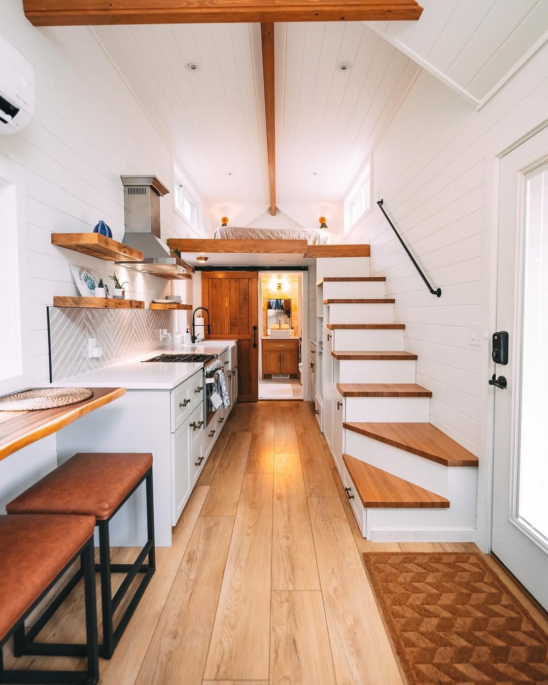 This tiny house kitchen feels like a breath of crisp Scandinavian air—sleek, sunlit, and immaculately put together. The pale wood floors warm up the clean white walls, while slimline shelving and clever storage keep things feeling light and effortless. Those wood-topped steps leading to the loft? They’re basically whispering “curl up with a book and coffee.”