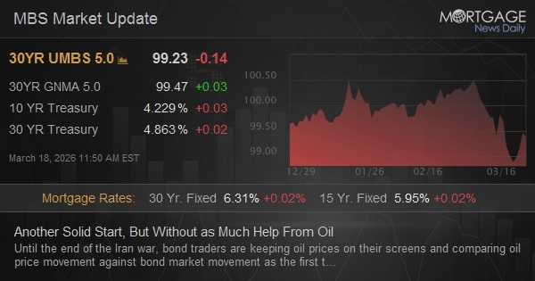 Till the end of the Iran war, bond traders are keeping oil rates on their screens and comparing oil price motion against bond market movement as the very first task on the everyday checklist. In so doing, we see a bit of outperformance on the part of bonds this morning. While there is solid directional connection (i.e. yields and oil were moving in the very same instructions at the same times), bond yields are lower today while oil is still a bit higher. Surprisingly, today’s highest minute of volume occurred with the 8:15 am ADP data which showed its biggest drop in months. That said, there was not a huge response in yields. The most convenient conclusion for now is that bonds are taking some solace in an absence of huge, new surges in oil rates as well as some helpful cues from the 4.30% bounce seen last Friday.