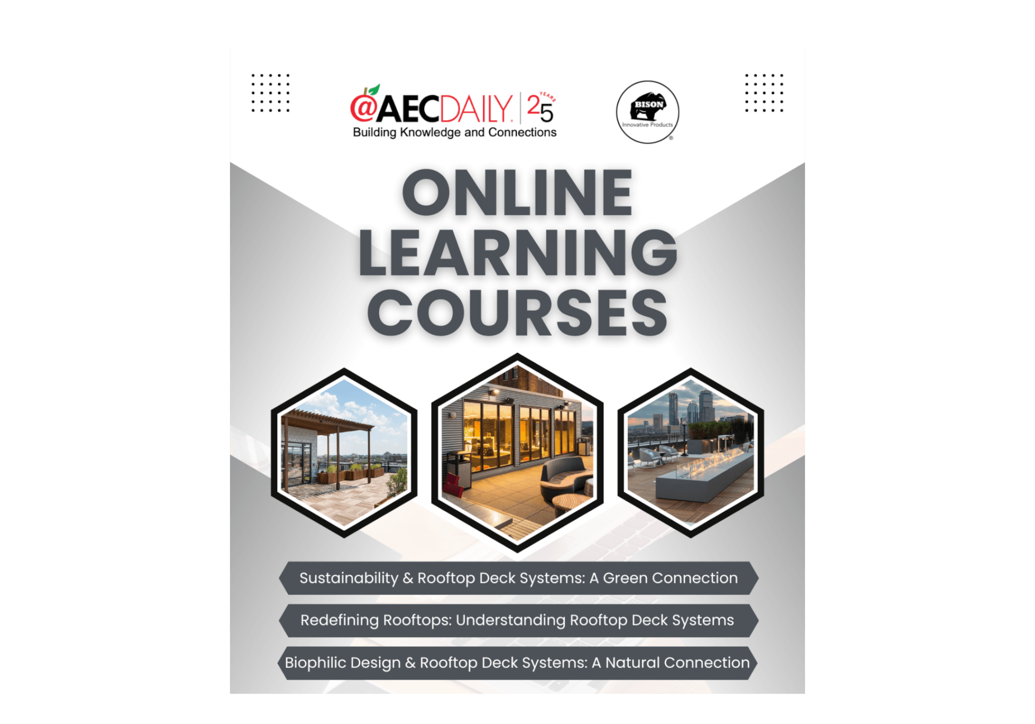 We are proud to partner with AEC Daily to provide three comprehensive online courses designed to help you master the technical and aesthetic nuances of rooftop development. Whether you are seeking to make continuing education credits or just stay ahead of industry trends, these modules provide the blueprint.