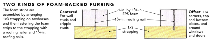 I assemble lengths of 1-in.-thick high-density expanded polystyrene (EPS) foam and 1 × 3 strapping picked up from my regional lumberyard. While the strapping is easily available, the high-density foam isn’t constantly a stock product, so I buy my foam from Insultech in Bridgewater, Mass. This foam withstands compression more than routine EPS, and it can be found in convenient 1-1/2-in. by 4-ft. pieces. Alternatively, I might cut complete sheets of rigid foam into 1-1/2-in.-wide strips on a tablesaw.