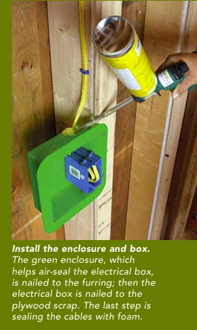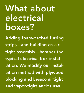 Air-sealing is vital when using fiberglass batts (see “Making Fiberglass Work,” FHB # 246), so we fill any holes or gaps with spray foam before installing the high-density R-30 batts. We take care to fill the stud cavities entirely with very little compression.