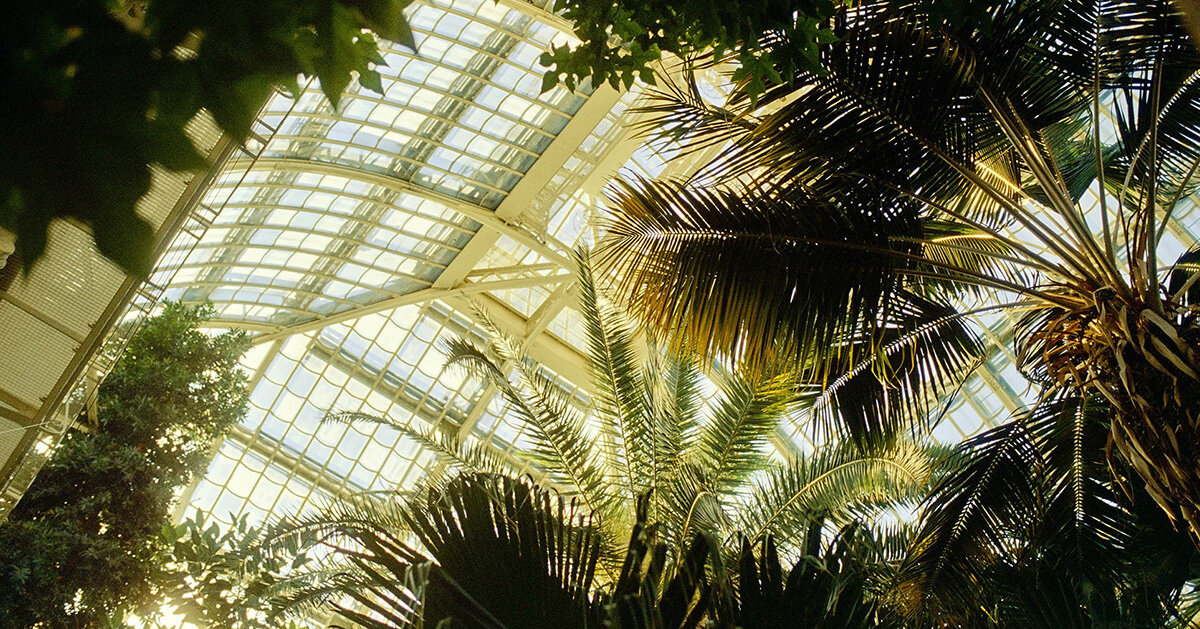of time and temperature. Originally constructed in 1881/82 on the premises of the previous Dutch Botanical Garden, the Palmenhaus stretches 113 meters and is divided into 3 interconnected structures. The central pavilion increases to 28 meters, its skyrocketing form flanked by two a little lower wings that together form a sweeping rhythm of arches and iron. This architectural structure is practical and meaningful, forming a delicate balance between industrial precision and organic flow.Each section of