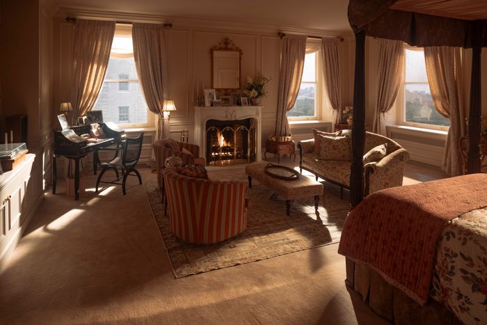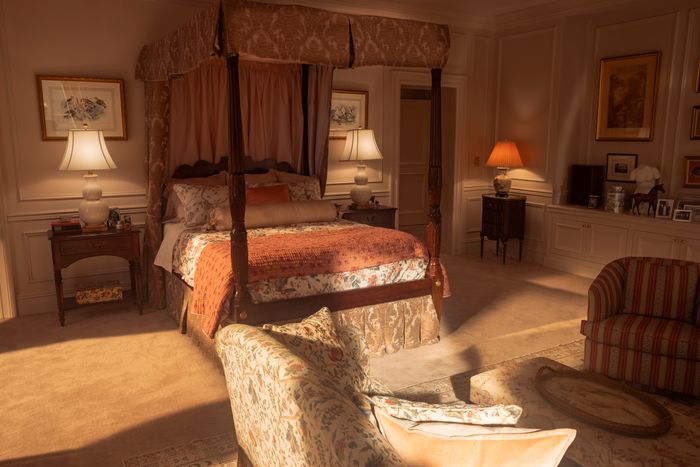 The artist who painted the official White House portraits also painted some personal family paintings for the Kennedys, and there’s this great painting of her on a couch reading to the kids when they’re really young. After being First Lady, she became a book editor at Doubleday. So that felt meaningful. We had one of our scenic artists paint our own version and had that in her bedroom.