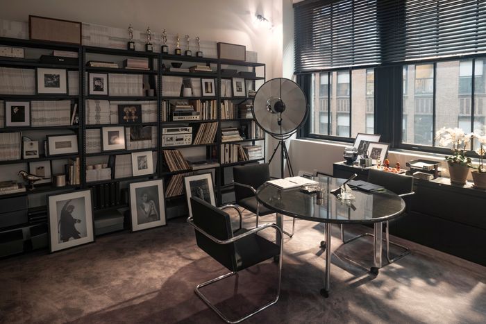Klein was photographed in his office with this Fortuny lamp. The industrial shelving shows Joe D’Urso’s taste. Photo: FX