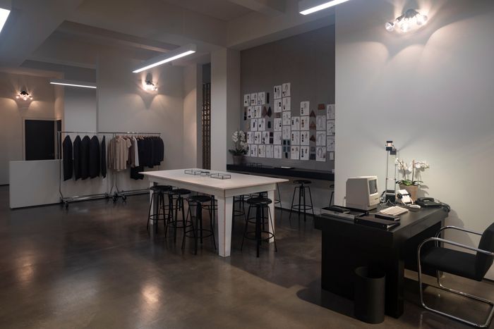 The show spans from 1992 to 1999 — which covers two distinct eras for Calvin Klein’s interiors. And the well of images from Calvin Klein runs deep, but you can’t just search it. I spent so much time scrolling through, and found that from the ’70s through the early ’90s, the design of the space was by the architect Joe D’Urso, who also did Calvin’s apartment. He was all about using industrial materials in high-end applications and part of a kind of high-tech, minimalist movement. So you’ll see powder-coated gray steel industrial shelving, those three-pronged exterior floodlight sconces, or a round, black granite table on chrome legs with wheels that D’Urso made for Calvin’s office. But in 1995, Klein opened a Madison Avenue flagship store designed by John Pawson. And that’s a whole different kind of minimalism, where every seam is hidden and every surface change ties into another space. We decided that the look for our show in general should be the more Pawson era, but I tried to put some of the D’Urso flourishes in, so we ended up with a mix of the two eras.