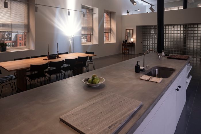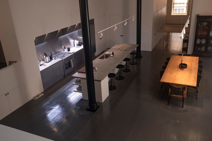 We were also thinking about artists’ lofts. You could imagine that an artist had that before John bought it, and there would’ve been paint splattered all over, so you could have sanded the floors down or you could have just painted the floors gray, which is what we did with a super-high gloss. And a lot of those great apartments had lofted bedrooms and lofted living rooms. I think the real ceilings were somewhere between nine and 12 feet, and we made them 16 feet so that we could accommodate for that. But the general layout was the same.
