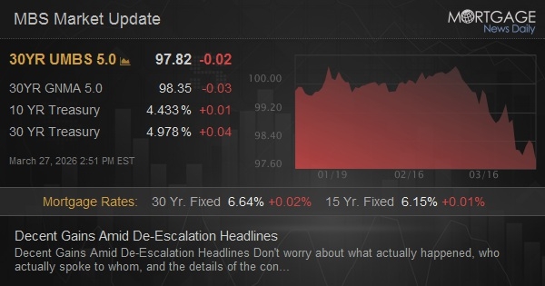 Weaker overnight then dramatically more powerful just after 7am on “war might end” headings. MBS up 6 ticks (.19) and 10yr down 1.8 bps at 4.366 after being as high as 4.442 right before 7am.