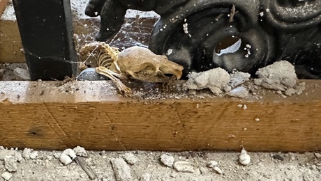 The second rat skeleton I found in my basement, this one on a piece of 2x4 blocking inside a closet wallHere’s the second rat skeleton I found in my basement, this one on a piece of 2×4 blocking inside a closet wall.