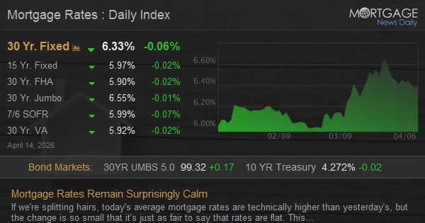 If we’re splitting hairs, today’s average home mortgage rates are technically greater than yesterday’s, but the modification is so little that it’s simply as reasonable to state that rates are flat. This liquidates a week with remarkably low volatility compared to that seen in March.
