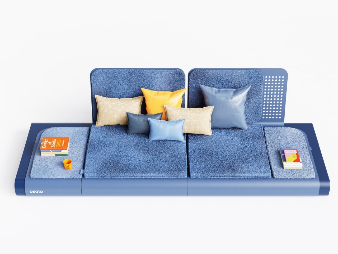 My sincere opinion is that the genuine accomplishment here is visual restraint. The makings reveal a deep blue surface, a sharp option due to the fact that it amplifies how clean and fixed the geometry actually is. The folded metal edges are smooth without being picky. The modular back-rests carry simply enough surface area texture to break up what could have easily tipped into something flat and institutional. The scattered cushions in orange, tan, and silvery blue include warmth without softening the structural clarity beneath them. There’s a stack of books and a coffee mug resting on the platform, and they look totally in your home there. That might be the most truthful thing a product render can show you.