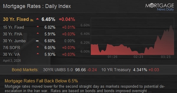 Mortgage rates moved lower for the second straight day as markets responded to potential de-escalation in the Iran war. Rates are based on bonds and bonds improved overnight as The President said the war could end even if the Strait of Hormuz was not yet reopened.