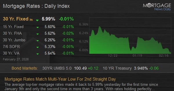 The average top-tier mortgage rates made it back to 5.99% yesterday for the first time since January 9th and only the second time in more than 3 years. With rates holding perfectly steady today, this is the 3rd day that matches that multi-year low.