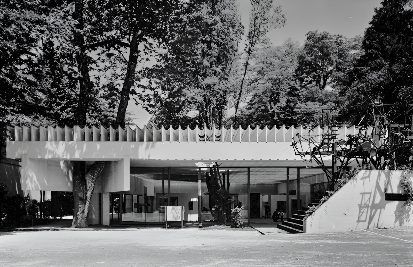 The Nordic Pavilion at the Venice Biennale in Venice, Italy, designed by Sverre Fehn and completed in 1962, serves as the shared exhibition space for Sweden, Norway, and Finland. Selected through an invited competition in 1958, the project is located within the Giardini di Castello between the Danish and U.S. pavilions, where existing plane trees and a sloping site shaped the design. Fehn integrated the trees directly into the architecture while creating a flexible exhibition hall of approximately 400 square meters capable of accommodating different curatorial arrangements. The pavilion is organized as an open rectangular space supported primarily by two L-shaped concrete walls and a single column, allowing uninterrupted exhibition surfaces and visual continuity with the surrounding park. Natural light is controlled through a distinctive roof composed of layered reinforced concrete beams forming a deep brise-soleil that diffuses Venetian daylight while preventing direct sun. Transparent roof panels admit filtered light, producing a uniform illumination suited to displaying artworks. Constructed primarily from white concrete, glass, and slate, the pavilion creates a restrained material palette that enhances the luminous interior atmosphere. By integrating trees, filtered daylight, and open circulation, the Nordic Pavilion establishes a continuous relationship between architecture, landscape, and exhibition space, becoming one of the most influential examples of Scandinavian modern architecture.