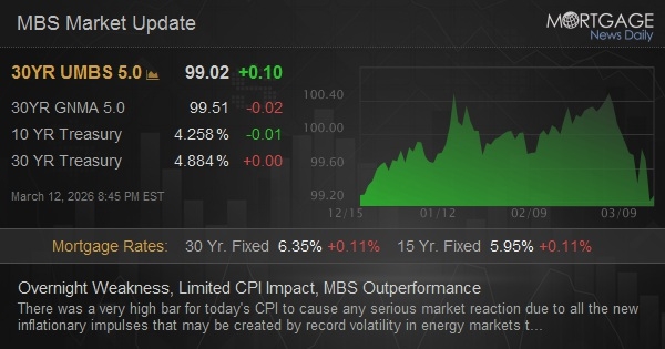 There was a very high bar for today’s CPI to trigger any serious market response due to all the brand-new inflationary impulses that might be created by record volatility in energy markets that hasn’t yet made it into the main information. To put it simply, CPI is a time capsule for a bygone era and the market is already trading the implications on future inflation reports to the best of its capability using oil rates as a proxy. Before the information, 10yr yields were a couple of bps greater overnight and have not moved given that the information. MBS are the same to a hair stronger after accounting for “the roll.”