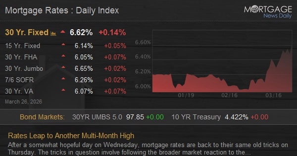 After a rather confident day on Wednesday, home loan rates are back to their same old tricks on Thursday. The techniques in question include following the broader market reaction to the Iran war which has actually caused substantial and almost exclusive upward movement in interest rates for the whole month of March.