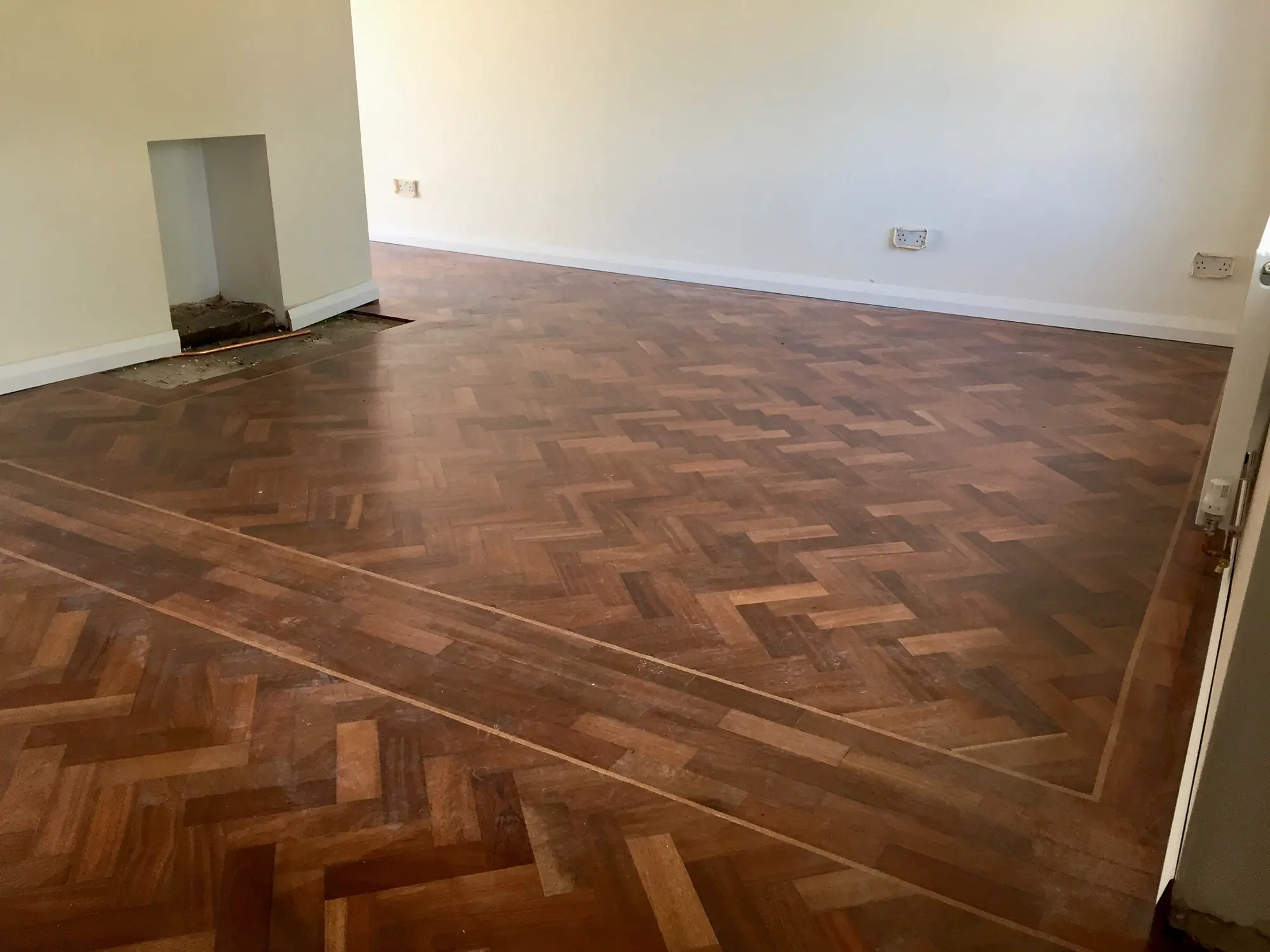 This parquet flooring was exposed underneath finishes of vinyl and carpet– after repair work and polishing it makes for an appealing function