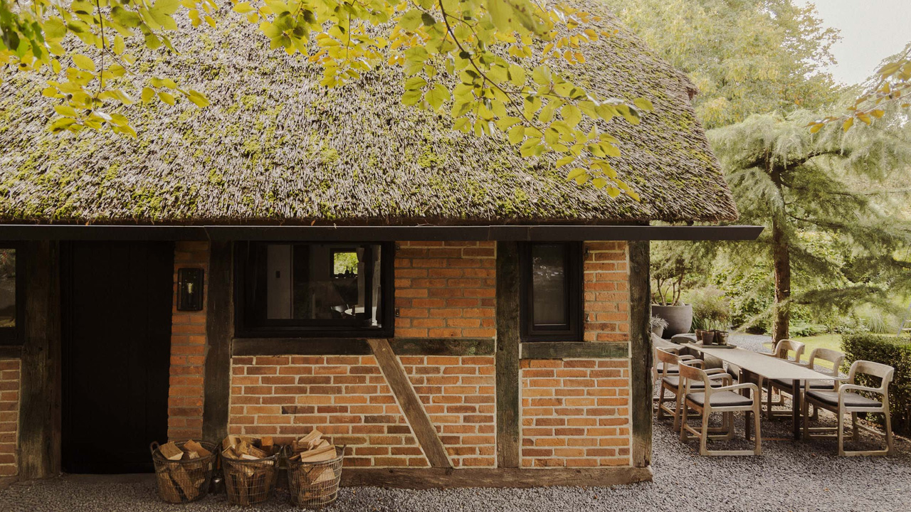 The significant outside of the historical structure shows off a standard half-timbered frame and bricks. The massive, steep thatched roofing system creates an eye-catching shape, while the surrounding garden harmoniously blends architecture with nature. The sculptural shrubs and hedges frame the structure while the lavish plant accepts your home.