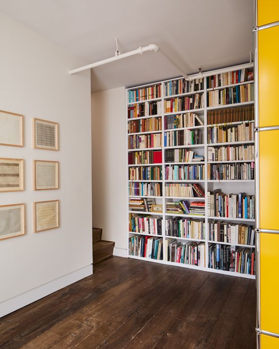 The Library The built-ins and a 2nd USM shelving system are downstairs, in between the bed rooms. The lithographs are by Agnes Martin from a 1990 series Photo: Annie Schlechter