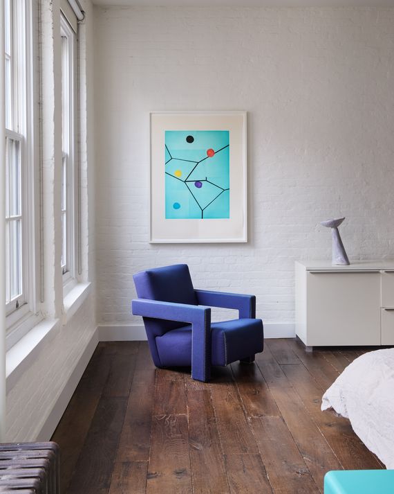 The Main Bedroom The Gerrit Rietveld chair was produced by Cassina. The 1998 etching is Mary Heilmann ‘s 21st Century Fox. The vase on the credenza is Untitled by Laura Letinsky from the 2022 “Preparing for Flowers” series. Photo: Annie Schlechter