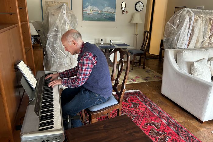 From top: Scott Wheeler composing at his keyboard in front of the wooden console that his daughter Lizzie uses for her bridal salon. Photo: Courtesy o… From top: Scott Wheeler composing at his keyboard in front of the wooden console that his daughter Lizzie uses for her bridal salon. Photo: Courtesy of the subjectsThe apartment with all the racks set up for Studio Dorothy. Photo: Courtesy of the subjects