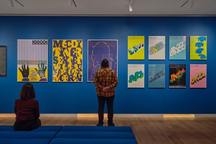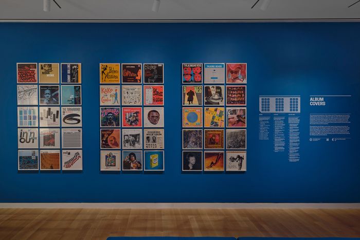 A wall of 3 distinct NYC designers and the genres they helped to define. On the left, 15 of Reid Miles’s Blue Note covers, exemplars of 1950s and 1960s’ jazz cover art; in the middle, Izzy Sanabria’s designs for salsa musicians such as Willie Colón and Ray Barretto, and on the right, Tibor Kalman and Maira Kalman of the firm M&Co, who created art for new wave and experimental artists such as the Talking Heads and Laurie Anderson. Photo: Thomas Barratt/