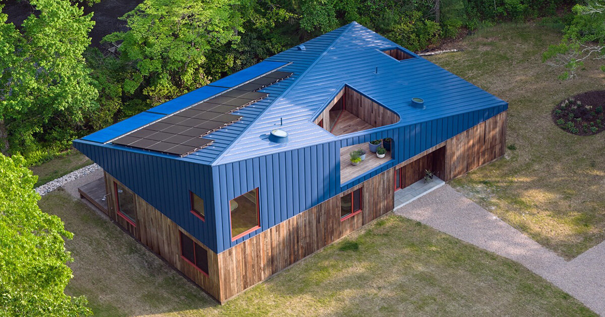 WORKac’s Riverhouse in Hopkinton, Rhode Island, turns floodplain constraints into a specifying architectural gesture that combines climate durability with spatial clearness and formal accuracy. The project is conceived as a compact, raised volume defined by a faceted blue metal roofing system that folds inward to take a central yard. Developed to satisfy Passive Home requirements, the home is raised above the ground in response to floodplain conditions. The timber-clad base supports a dramatically articulated upper shell, where incorporated solar panels and accurate openings provide your home a clear, almost graphic presence within its woody setting.